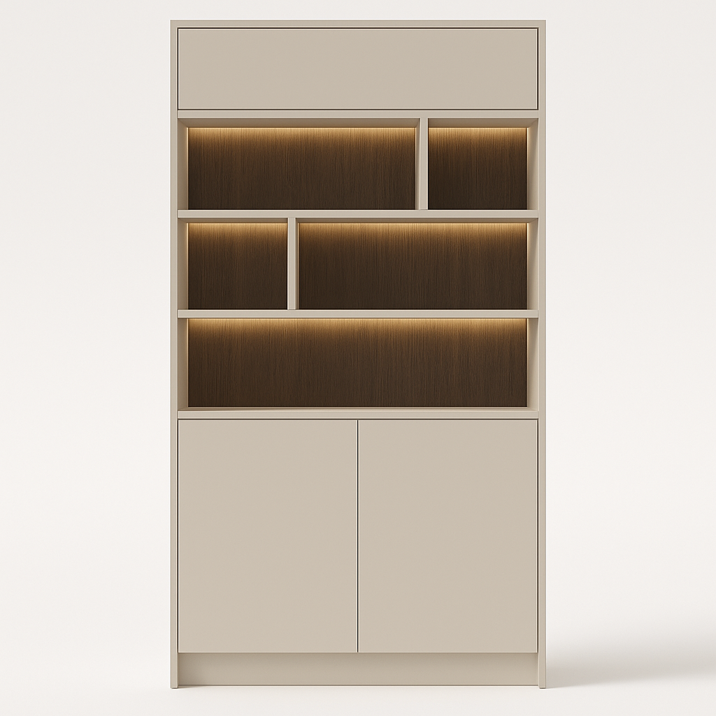 De push-to-pull deursystemen zorgen voor een strak front zonder zichtbare handgrepen, wat het minimalistische karakter van de kast versterkt. Dankzij de open vakken en gesloten opbergruimte is de kast zowel decoratief als praktisch inzetbaar. Perfect voor het presenteren van objecten, boeken en kunststukken, terwijl je persoonlijke items elegant uit het zicht blijven.