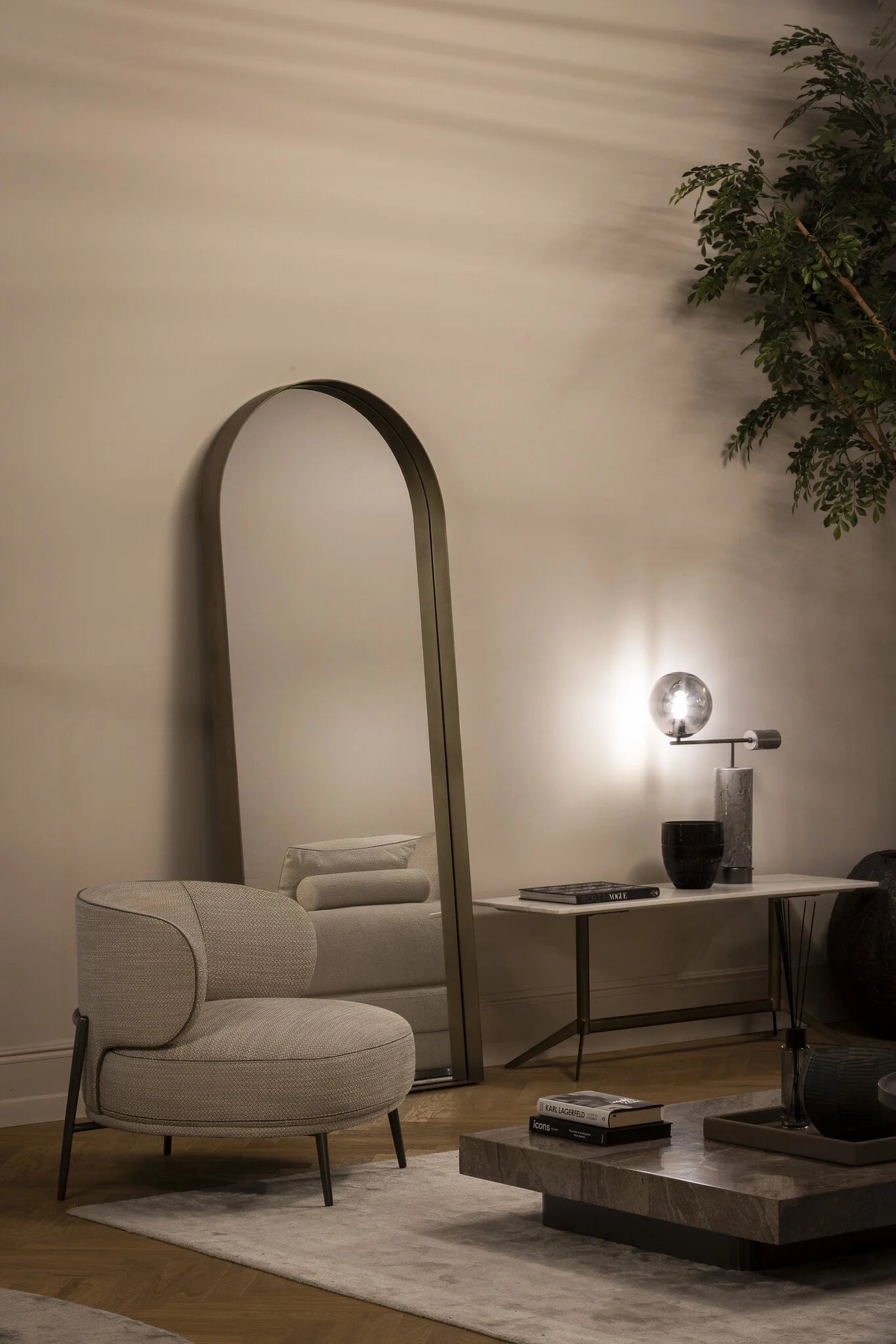 Stijlvolle "full length" Milos spiegel van The Grand Collection met een slank, robuust metalen frame, rond gevormd in een antique brons finish. Een tijdloos ontwerp dat perfect past in zowel moderne als klassieke interieurs.