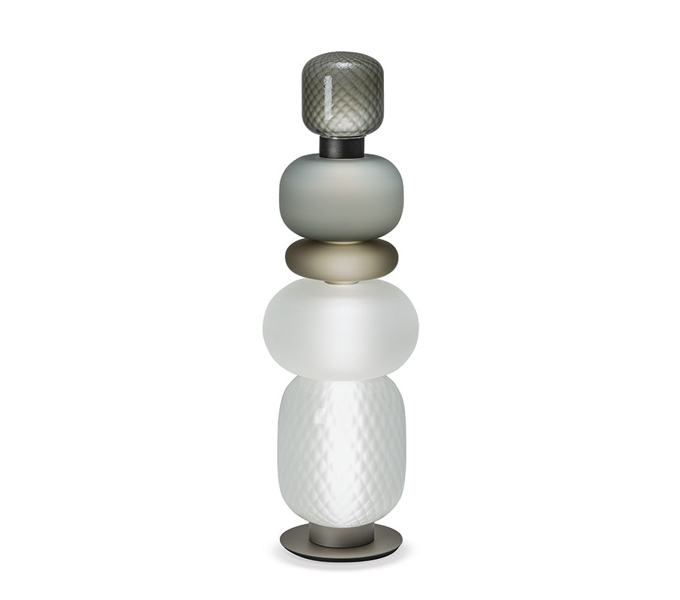 De boven- en onderelementen van deze designer vloerlamp zijn uitgevoerd in het traditionele balloton-glas, een ambachtelijke techniek waarbij een metalen mal wordt gebruikt om een drie-dimensionaal ruitpatroon te creëren. Tijdens het glasblaasproces vormen de kleine spikes aan de binnenzijde van de mal het gesmolten glas tot de kenmerkende, facetachtige structuur die zo typisch is voor balloton-glaswerk.