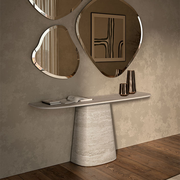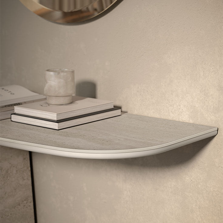 Opvallend is het subtiele detail aan de korte zijde van de sokkel: een verzonken verticale groef in keramiek, die het oppervlak op elegante wijze doorbreekt. Het resultaat is een moderne console die klassieke afwerkingen, geïnspireerd op natuurmarmer, combineert met innovatieve productietechnieken.