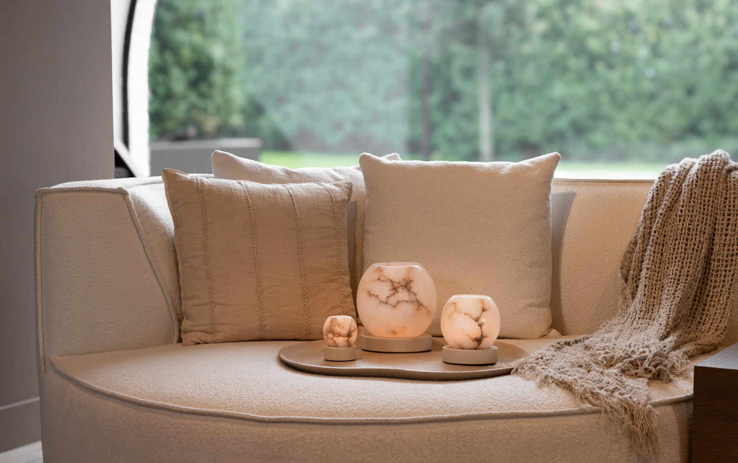 Een prachtig Olessa windlicht van Raf Deluxe in alabaster in een ronde vorm op een voet van zandsteen. De zandsteen voet is uitgeslepen in een ronding, zodat het alabaster windlicht er precies in past.