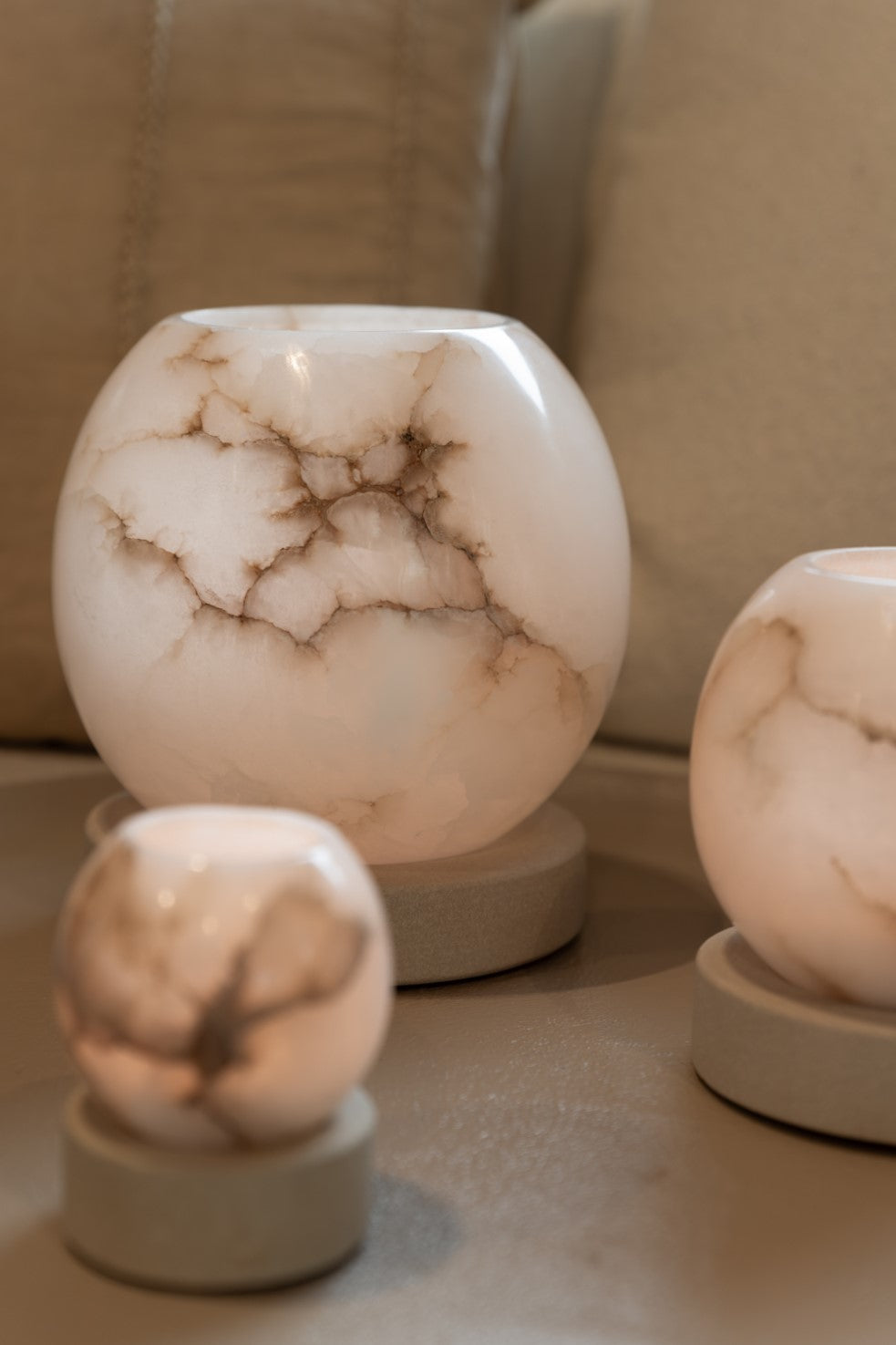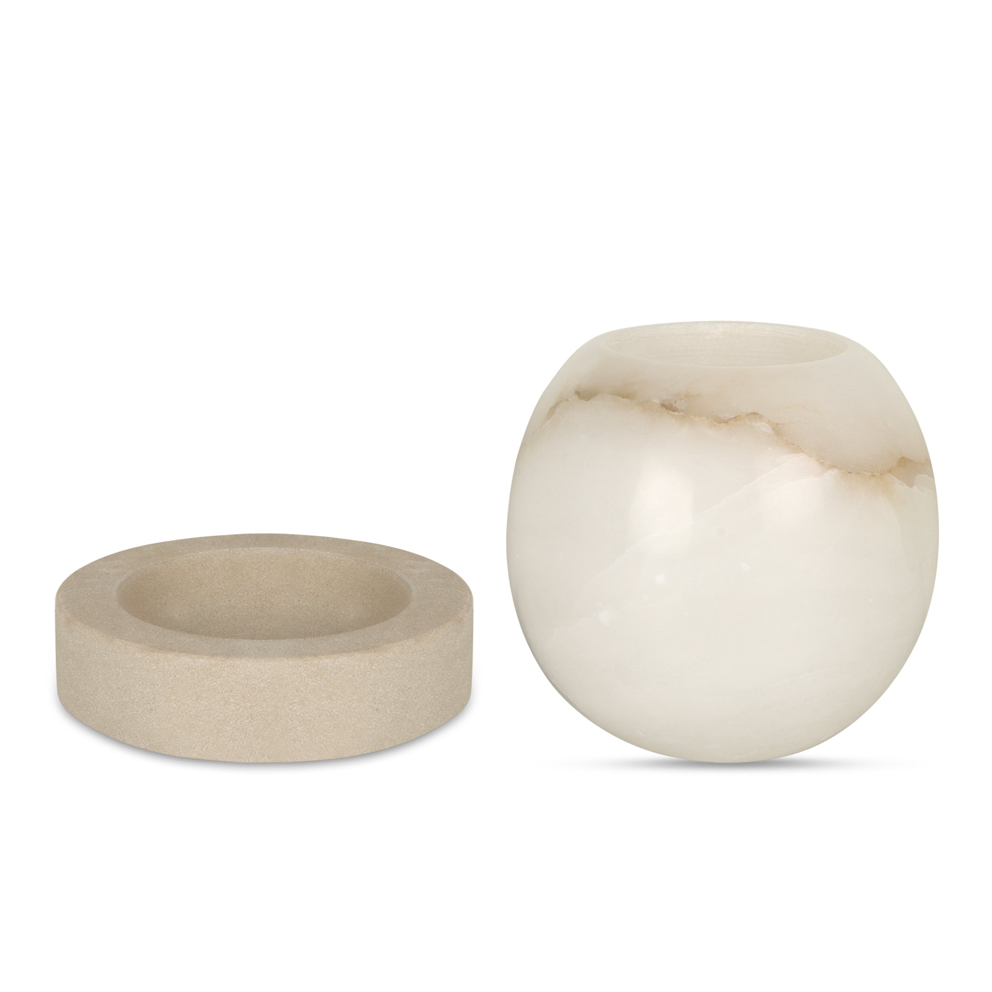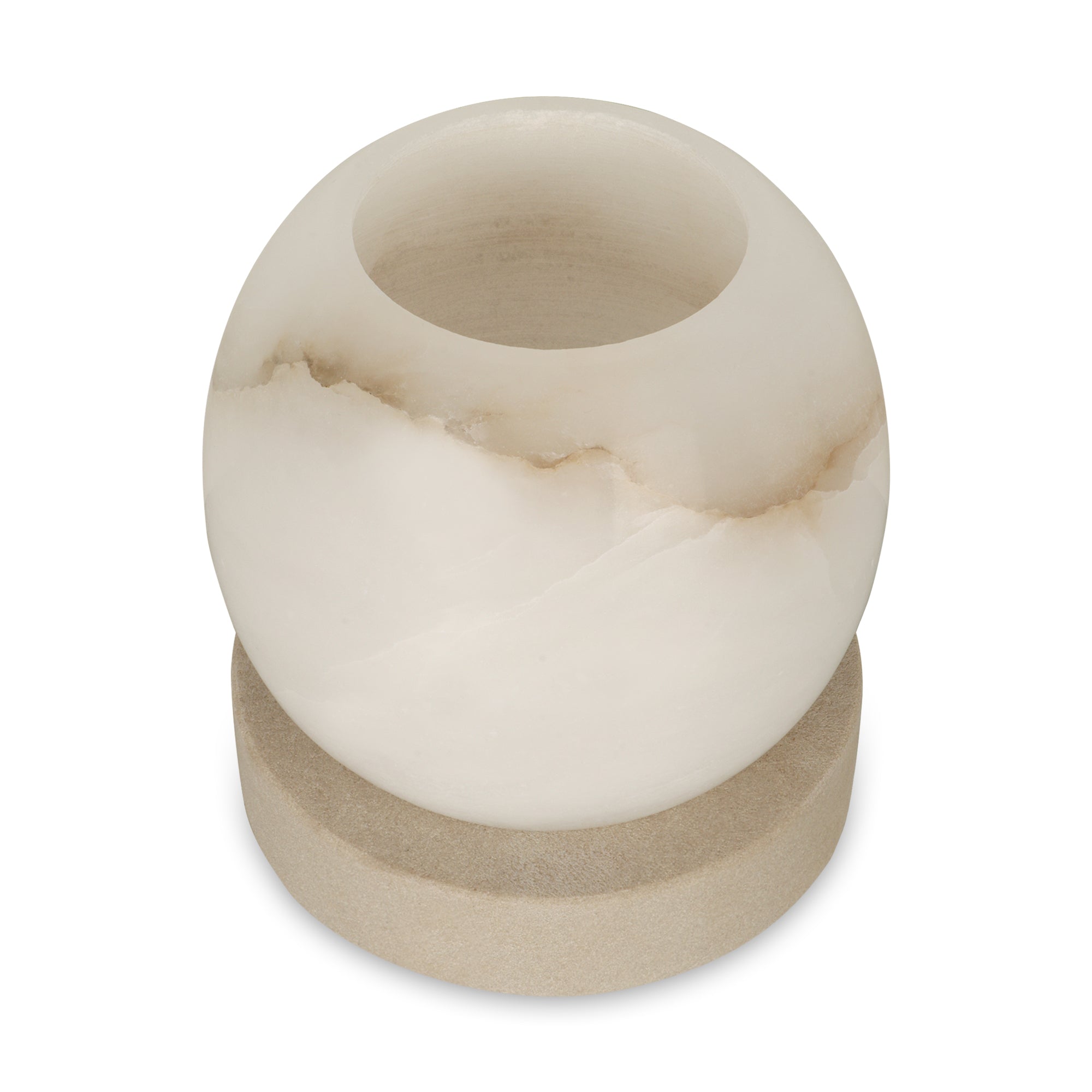 Een prachtig Olessa windlicht van Raf Deluxe in alabaster in een ronde vorm op een voet van zandsteen. De zandsteen voet is uitgeslepen in een ronding, zodat het alabaster windlicht er precies in past.