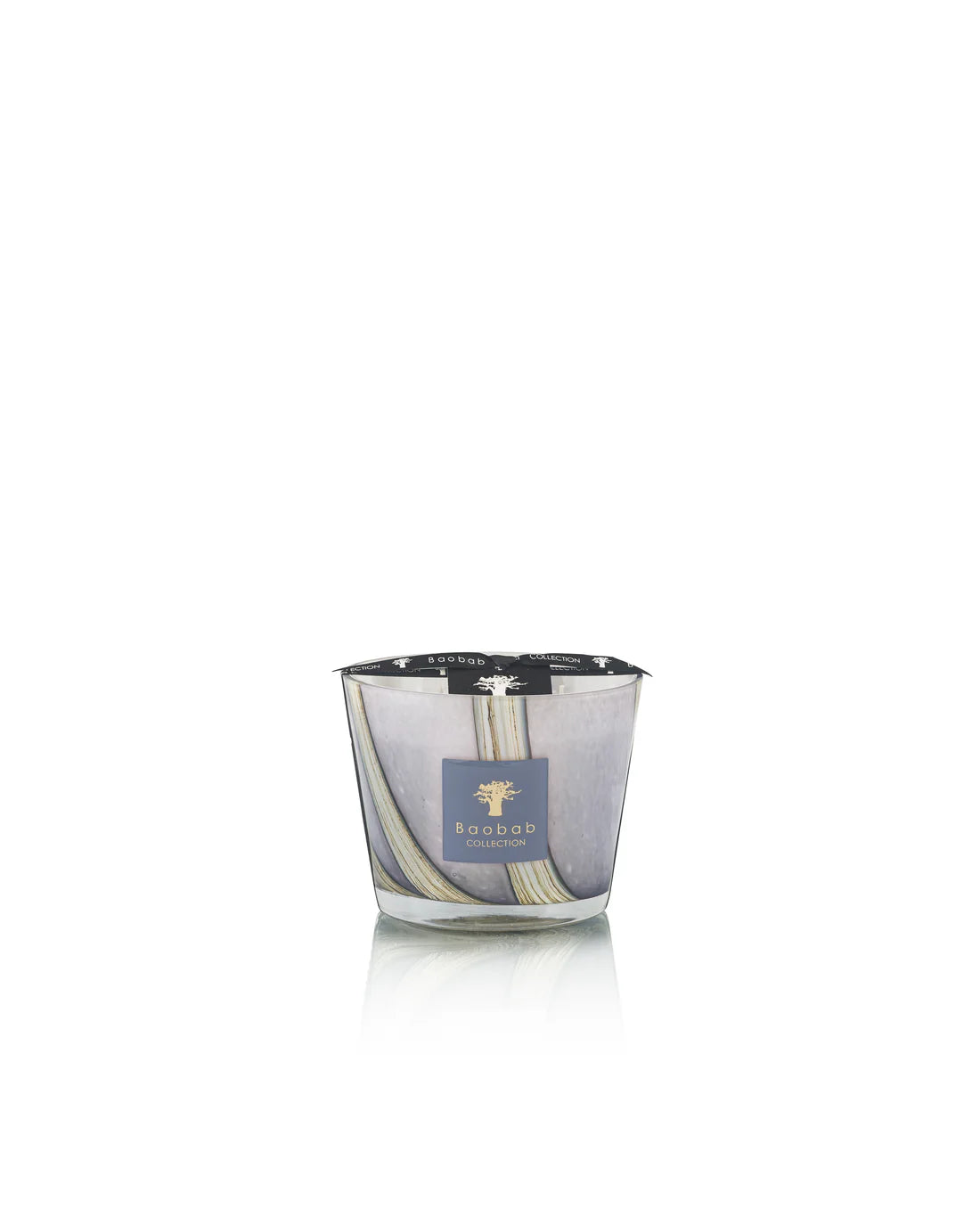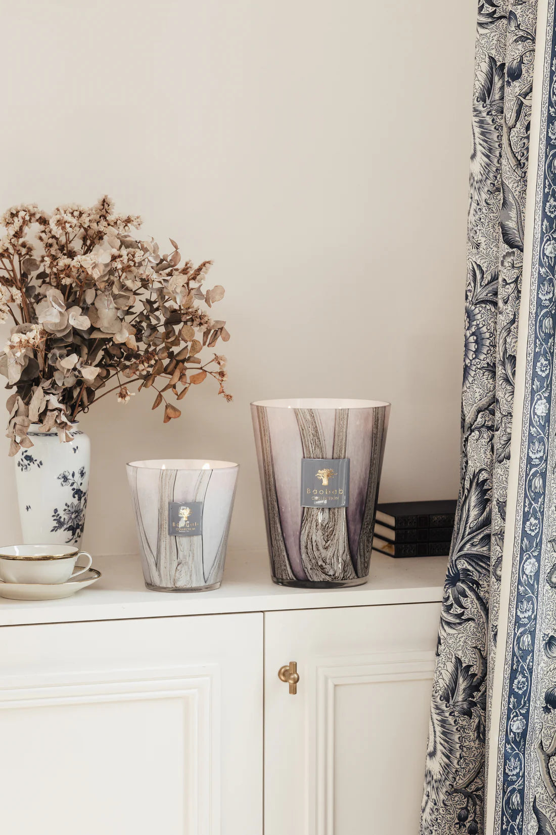 Het luxe glas van de Brocéliande geurkaars is verfijnd versierd met verticale lijnen die doen denken aan bomen die naar de hemel reiken. De subtiele kleurschakeringen van grijs tot paars geven een tijdloze elegantie aan ieder interieur. Wanneer de kaars wordt aangestoken, verspreidt zich een betoverend parfum dat licht, aromatisch en houtachtig is – als een veelbelovende toverspreuk.