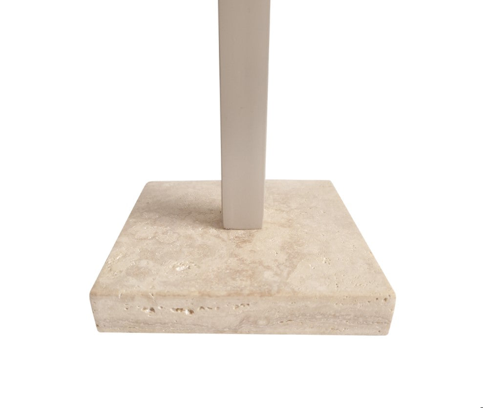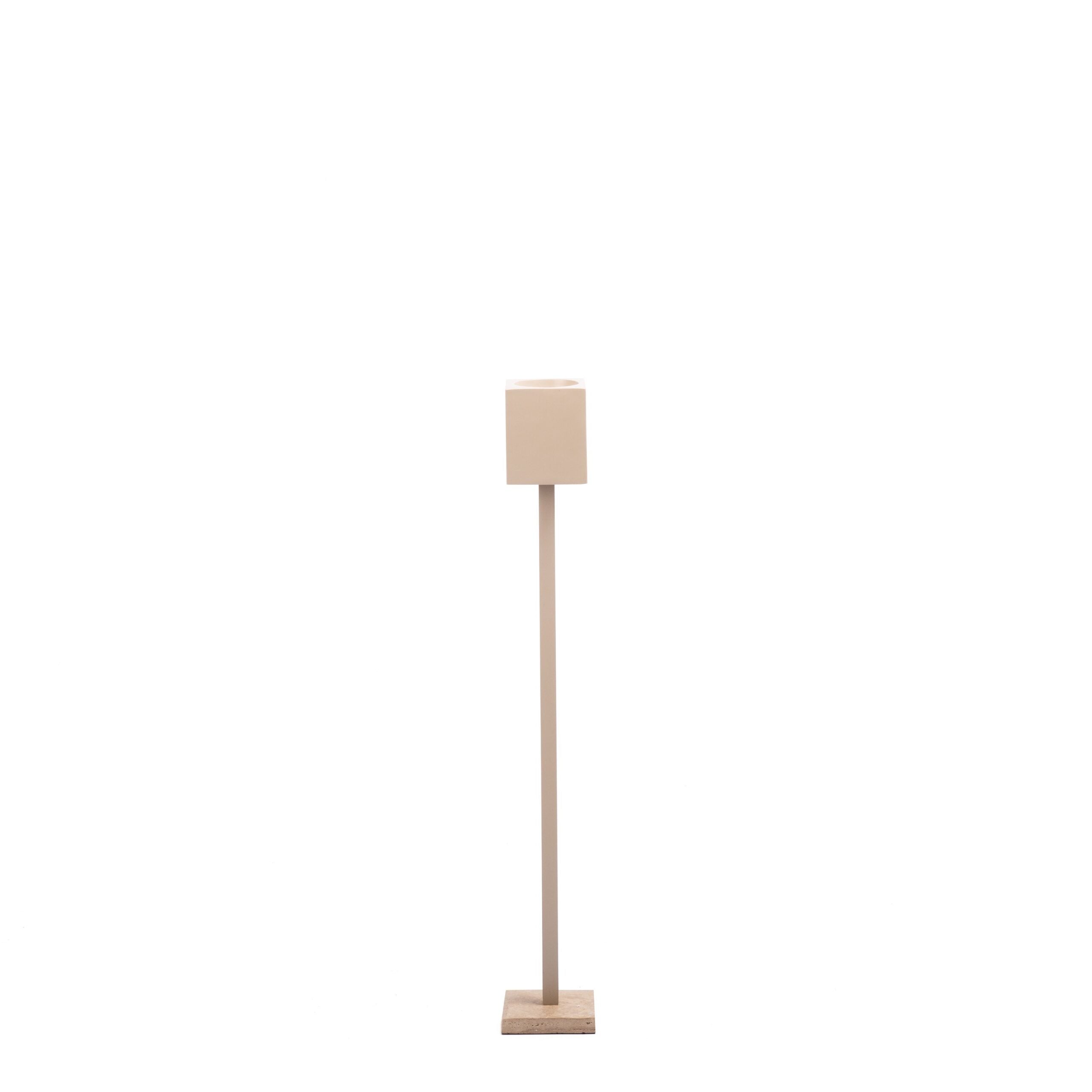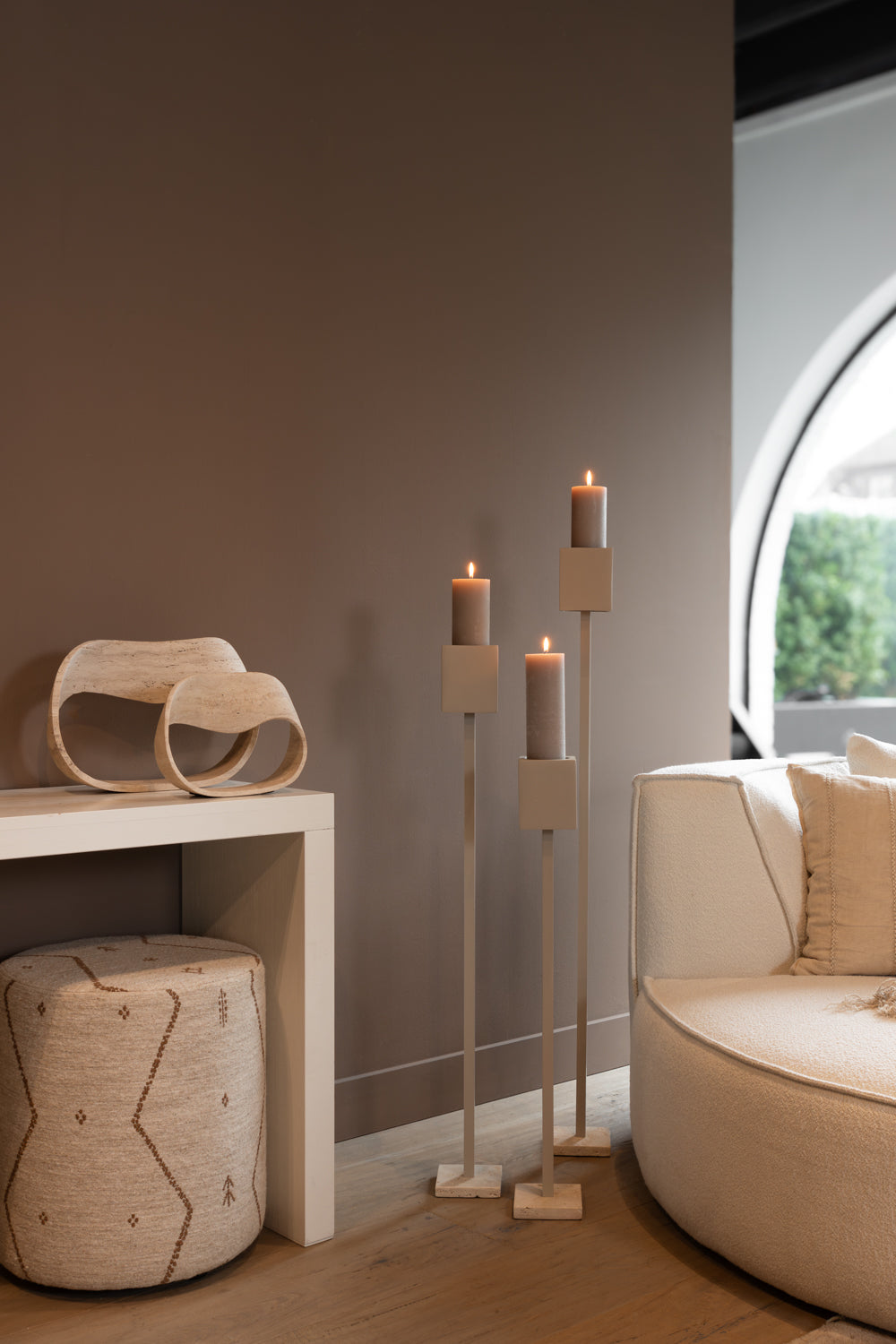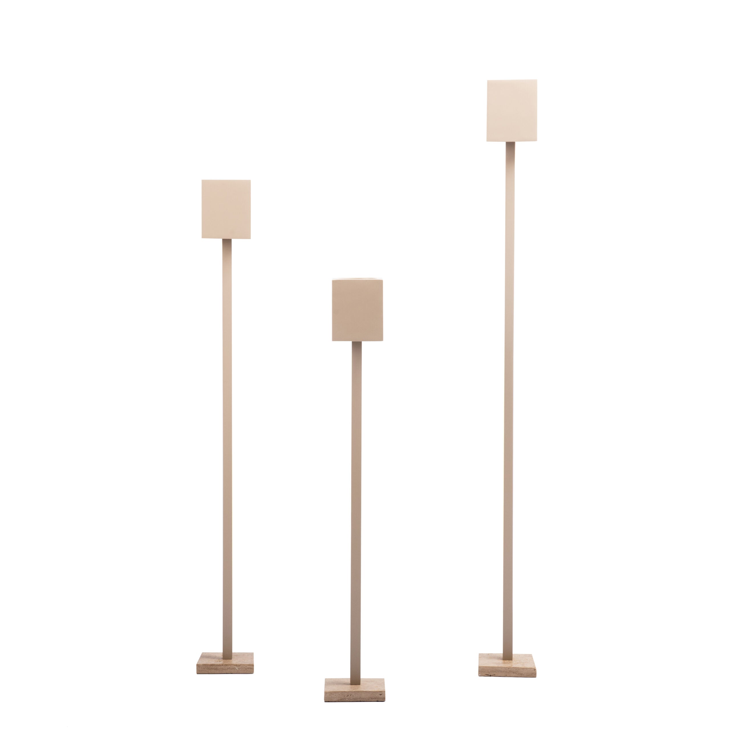 De Farra vloerkandelaar van Ref Deluxe is gemaakt van aluminium in een zachte en ingetogen beige kleurtint, die het travertin voetstuk mooi complimenteert. Stijlvol en uniek, maken deze kandelaren een statement in elk interieur.