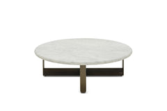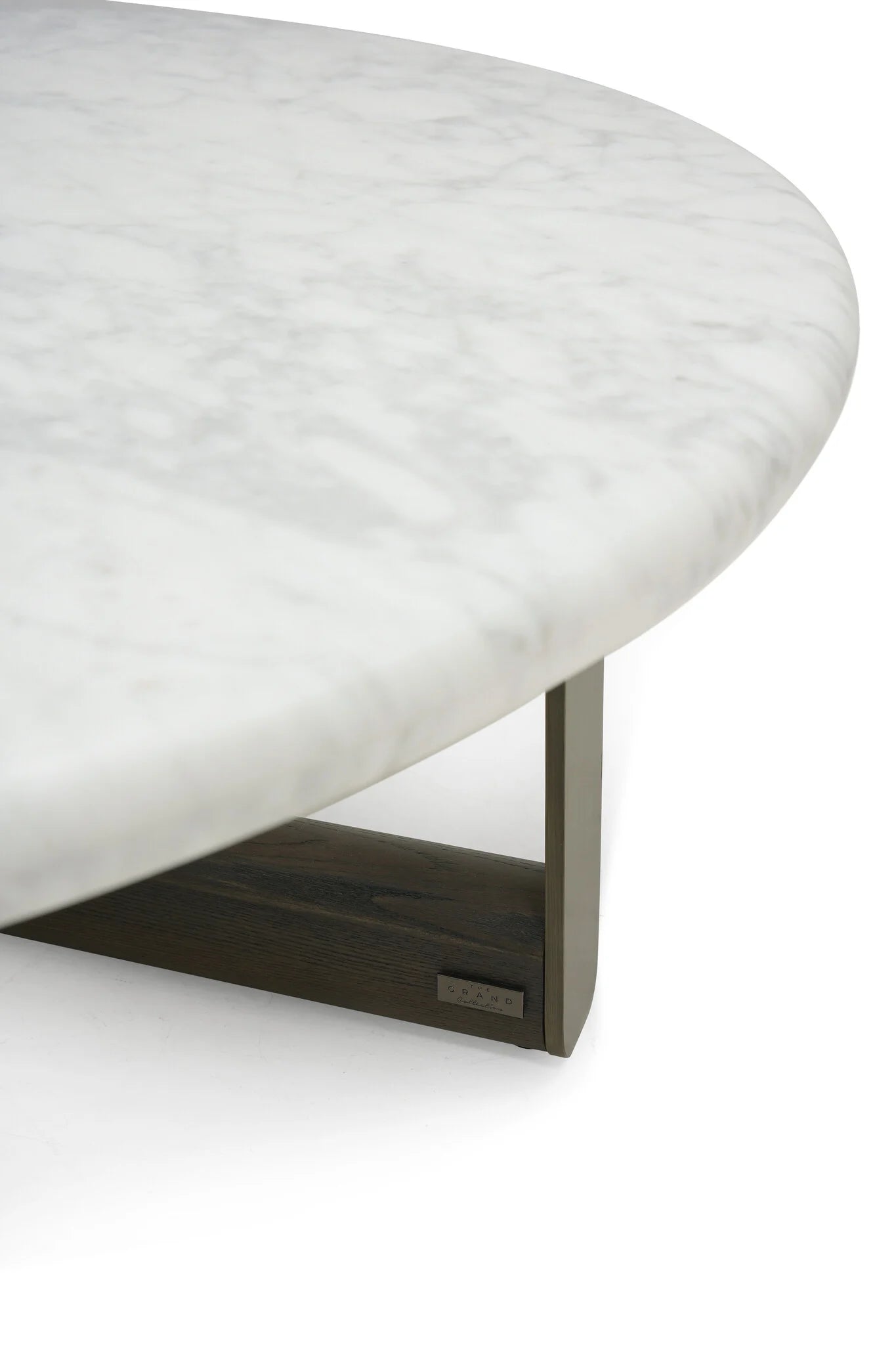 Firenze Ronde salontafel van The Grand Collection. De mix van brons, zwart gebeitst hout en een wit marmeren blad maakt het een luxe en tijdloos meubelstuk dat in ieder interieur past.