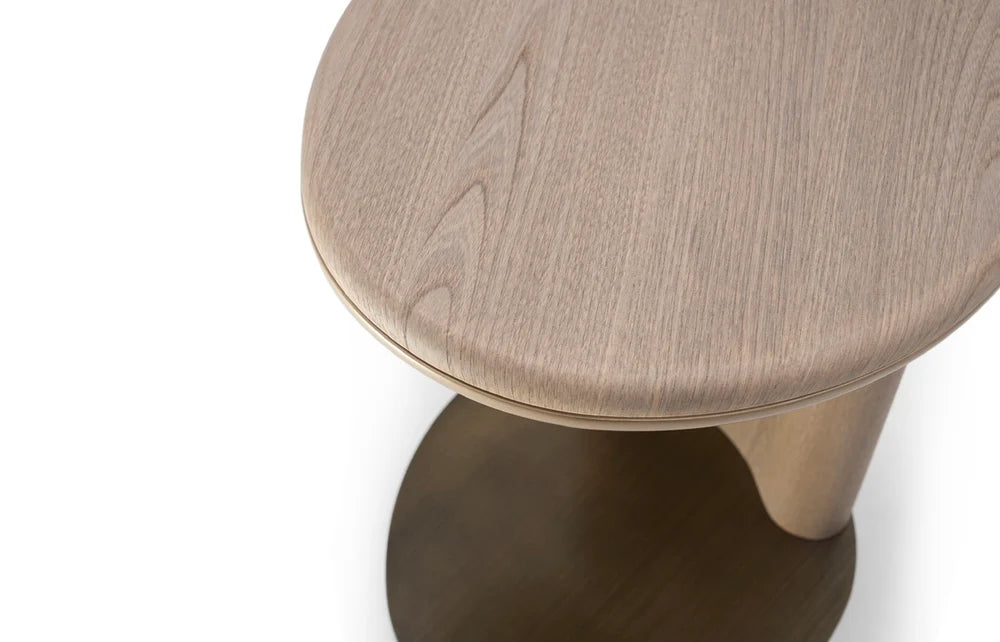 De compacte afmetingen en precieze geometrie zorgen voor een strak silhouet, met een prettig aanvoelend tafelblad dat contrasteert met een slankere, ondersteunende structuur. De randen zijn strak afgewerkt voor een rustige, architectonische uitstraling.