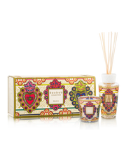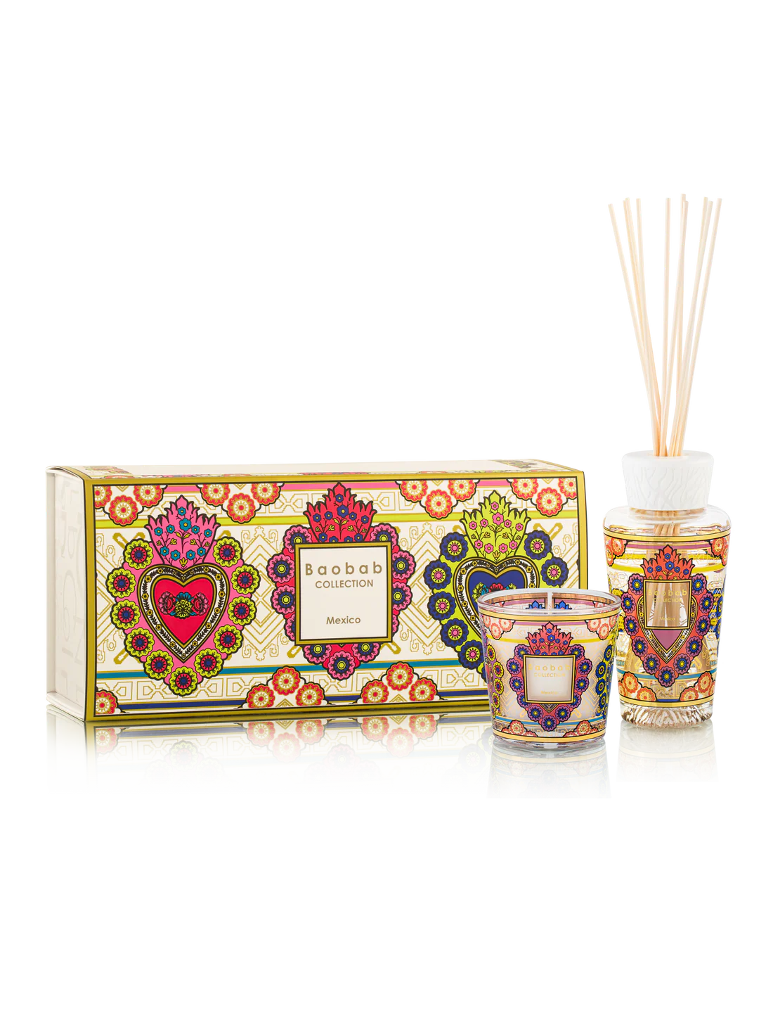 De Mexico-geurkaars en parfumdiffuser van Baobab zijn voorzien van een veelkleurige gouden zeefdruk die een ex voto hart voorstelt, een klein voorwerp dat spiritueel wordt gebruikt om een wens in vervulling te laten gaan of om dank te zeggen voor een genade die ons is geschonken. De hartmotieven komen terug over het hele glas en op de achtergrond is een subtiel broderiemotief te zien dat ook terug te vinden is in de Mexicaanse ambachtskunst en in de corsages van Frida Kalho.